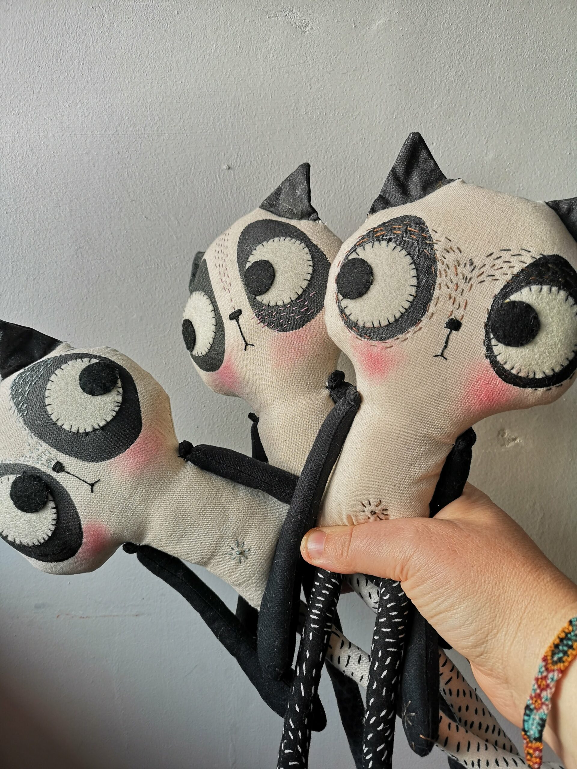 Unique kitty-cat dolls made from fabric and fluff